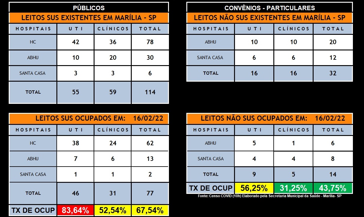 Com relação aos leitos SUS, das 55 vagas disponíveis, 46 estavam ocupadas nesta quarta-feira, restando apenas nove estavam disponíveis, permanecendo ainda na faixa vermelha.
