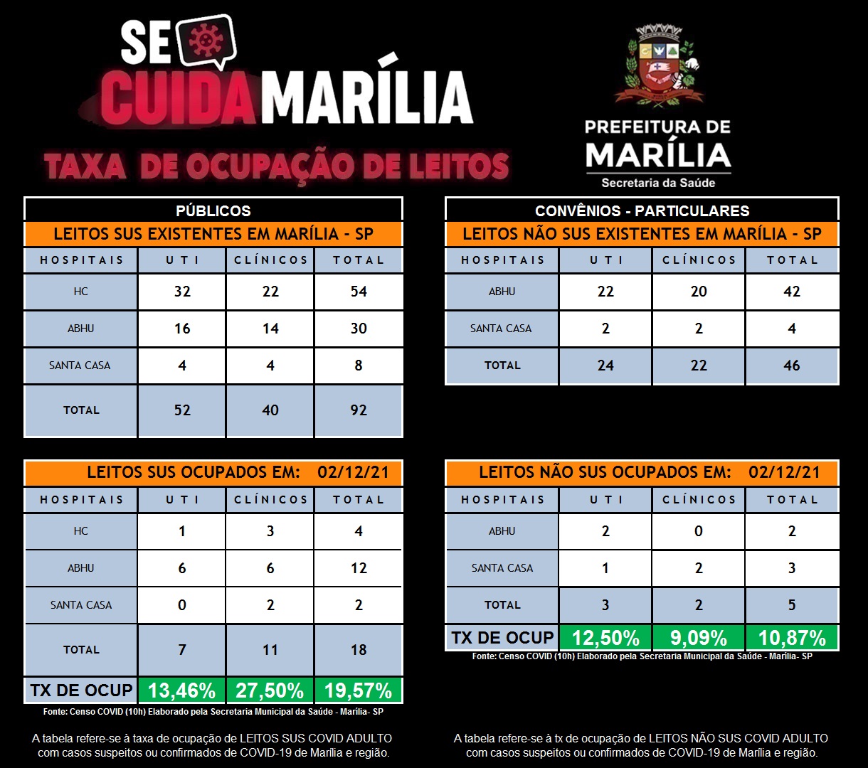 "O quadro mostra a taxa de ocupação atual dos leitos COVID de UTI e Enfermaria, com uma nova desmobilização de leitos ocorrida em dezembro no HC, o que justifica o ligeiro aumento desta taxa. Em breve a Santa Casa também promoverá a redução dos leitos UTI COVID", informou o secretário Cássio Luiz Pinto Junior.