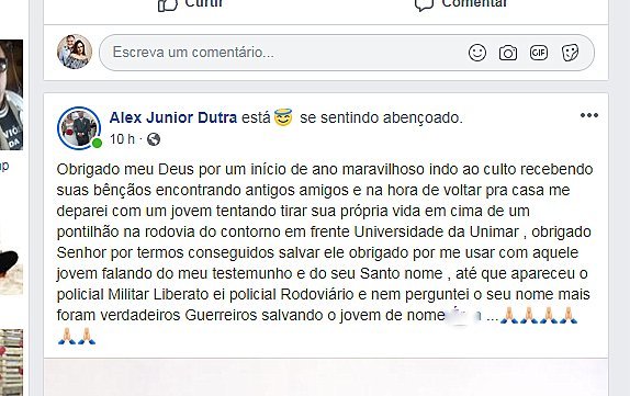 "Obrigado Senhor por termos conseguidos salvar ele obrigado por me usar com aquele jovem falando do meu testemunho e do seu Santo nome", afirmou Alex numa postagem no Facebook.