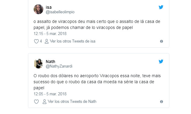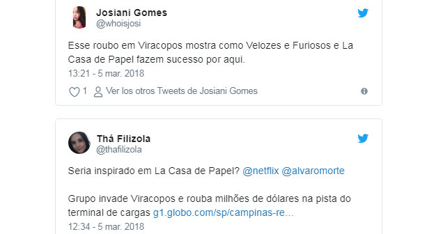 Em pouco tempo, internautas começaram a comparar o caso do assalto com a série da Netflix La Casa de Papel, que conta a história de um elaborado roubo à casa da Moeda, na Espanha.