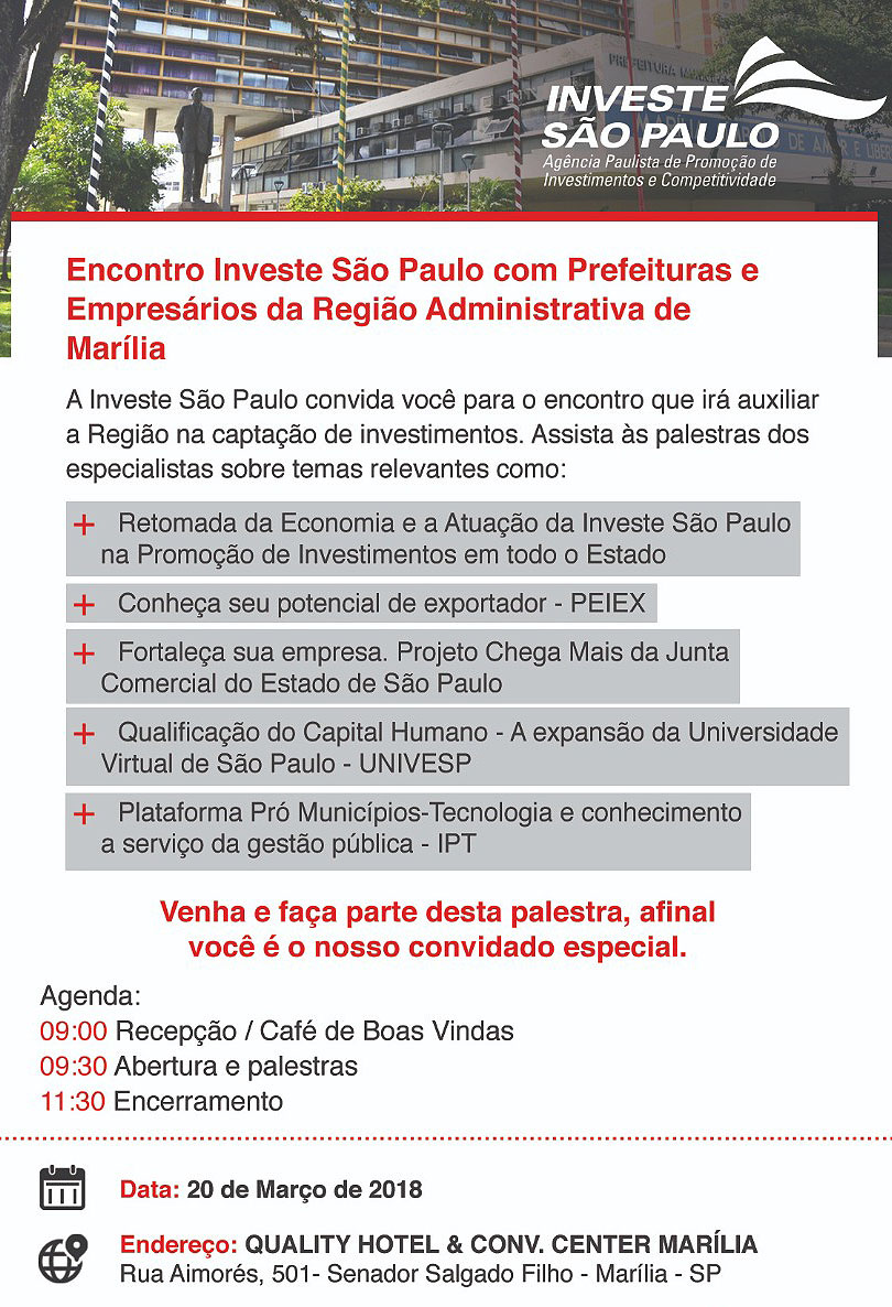 A Investe São Paulo realiza na terça-feira (20), às 9h no Quality Hotel e Convention Center de Marília, o quinto encontro com empresários e gestores municipais que serão feitos em cada uma das 17 regiões administrativas do Estado de São Paulo.