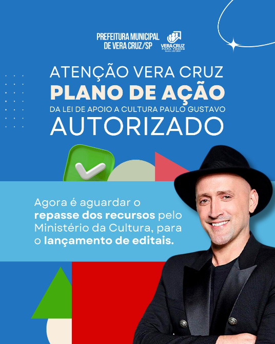 Investir na cultura no município de Vera Cruz também é um das prioridades da administração do prefeito Rodolfo Davoli. Nesse sentido, a administração municipal teve o seu Plano de Ação da Lei Paulo Gustavo autorizado pelo Ministério da Cultura. O Plano foi cadastrado na plataforma TranfereGov, no dia 03 de julho.