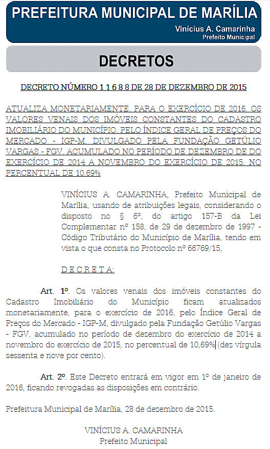 De acordo com o decreto "“Os valores venais dos imóveis constantes do Cadastro Imobiliário do Município ficam atualizados monetariamente, para o exercício de 2016, pelo Índice Geral de Preços do Mercado – IGP-M, divulgado pela Fundação Getúlio Vargas – FGV". A variação é referente ao período de dezembro de 2014 a novembro do exercício de 2015.