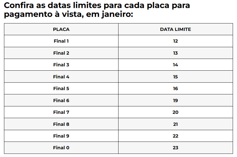 O pagamento segue o final da placa do veículo e pode ser feito à vista, com desconto de 3%, ou parcelado em até 5 vezes, de acordo com o valor do imposto devido.