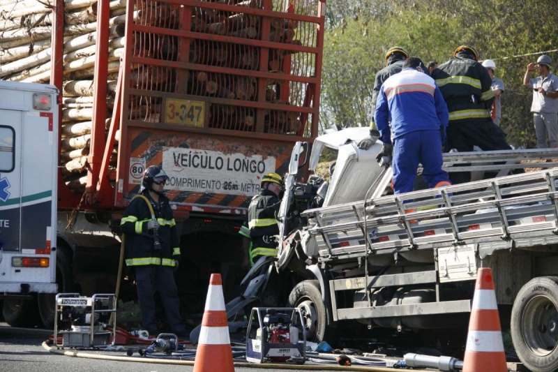 De acordo com a Polícia Rodoviária Estadual, as vítimas eram dois irmãos, de 49 e 50 anos. A frente do caminhão ficou completamente destruída depois de bater na traseira de uma carreta, que estava carregada com toras de madeira.