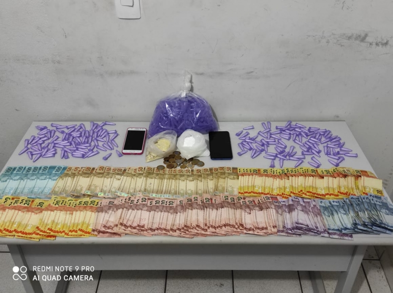 Os policiais flagraram a menor fazendo a contagem do dinheiro sobre o colchão de um dos quartos. Nas buscas os militares localizaram a droga acondicionada em pacotes, um saco transparente contendo aproximadamente 500 pinos na cor roxa vazios e dois sacos contendo uma quantidade a granel de cocaína e outro na cor amarelada com algumas pedras de crack, e ainda um telefone celular.