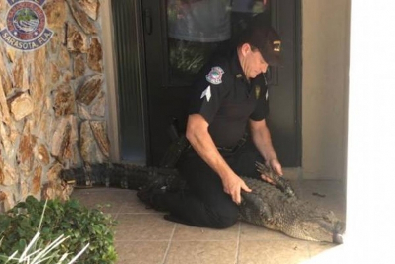 Um aligátor (jacaré americano) foi capturado pela polícia da Flórida após ser encontrado no jardim de uma casa em Sarasota.