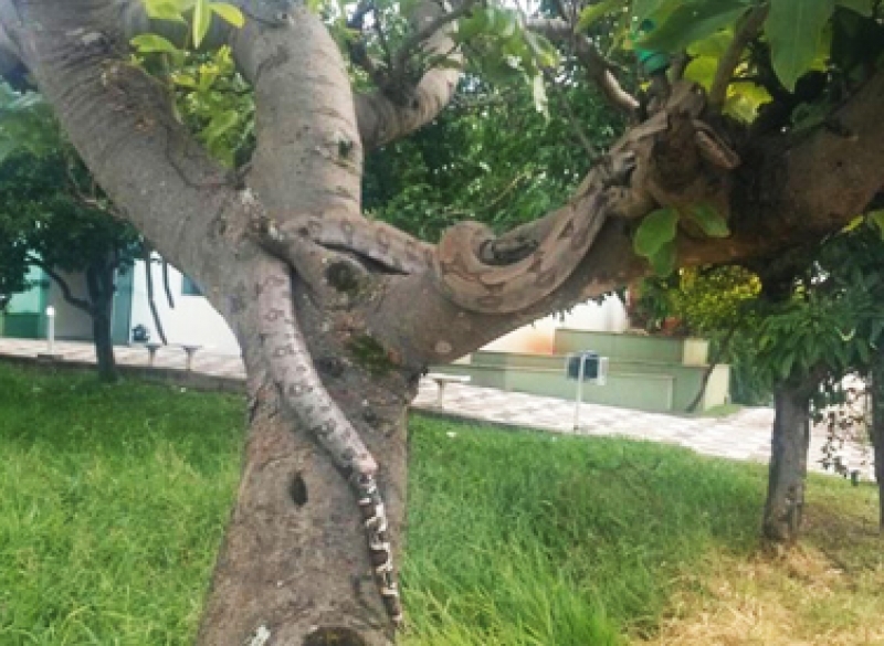 Uma jiboia foi vista em uma árvore, em um terreno baldio no centro de Assis, na manhã desta segunda-feira, 15.