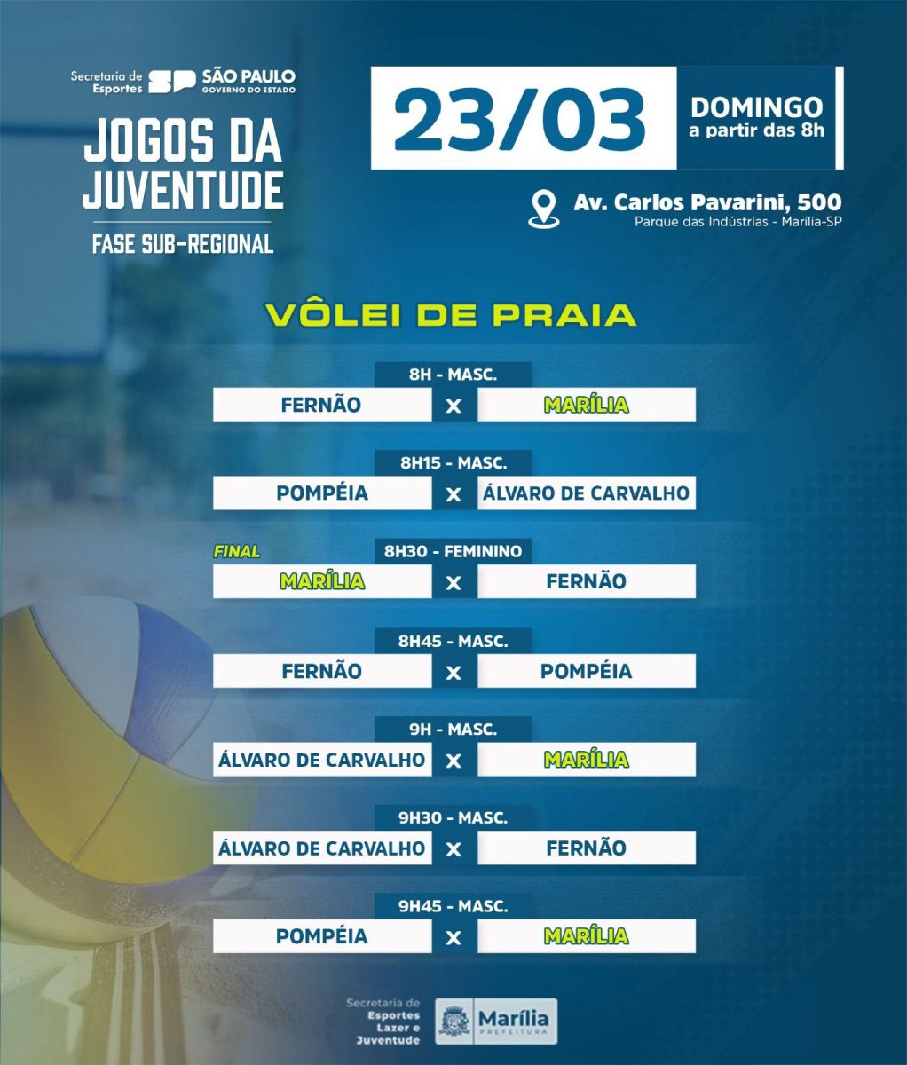 Começa neste domingo (dia 23) a fase sub-regional do 40º Jogos Abertos da Juventude. A partir das 8h, Marília será sede da modalidade Vôlei de Praia nas categorias feminino e masculino, com a participação das equipes marilienses.