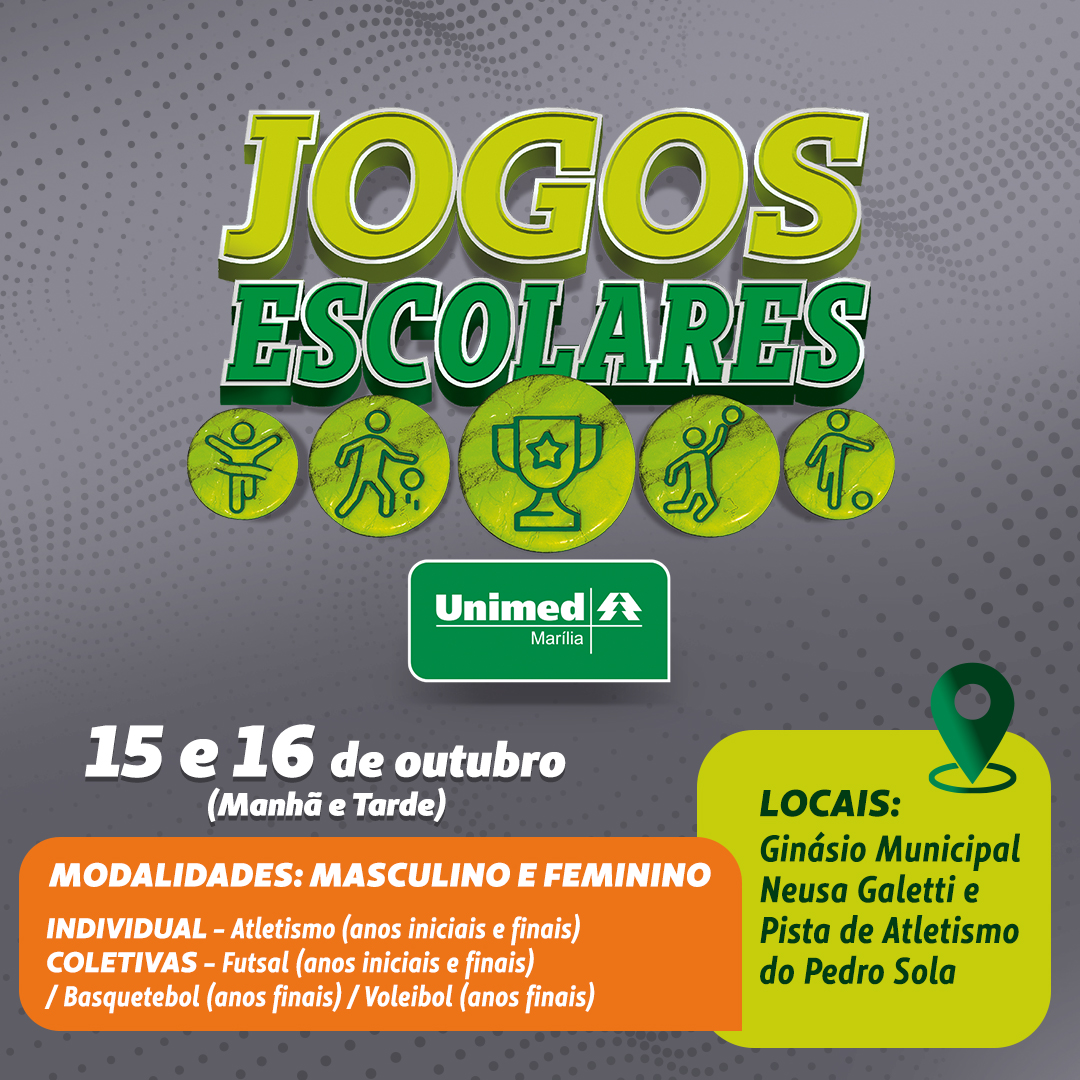 O 1º Jogos Escolares da Unimed Marília, acontece neste fim de semana, dias 15 e 16 de outubro, no Ginásio Municipal Neusa Galetti e na Pista de Atletismo do Pedro Sola.