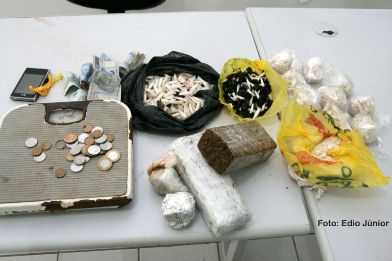 Com ele, dois tabletes de maconha, diversos pinos de crack e cocaína prontos para consumo, centenas de pinos vazios e até uma muca de cocaína foram encontrados. Uma balança para pesar entorpecente e uma certa quantia em dinheiro também foram apreendidos.