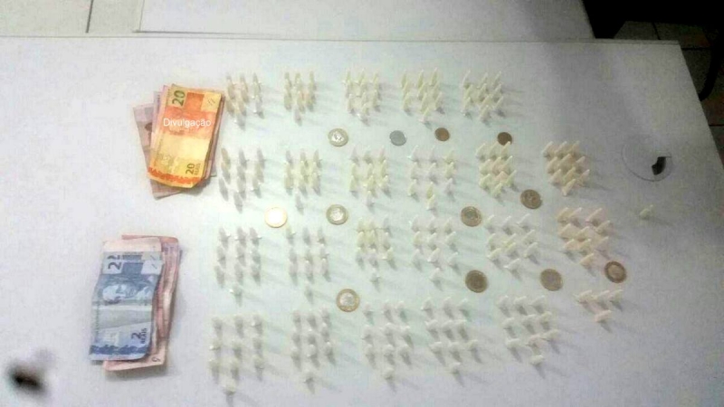 Em revista pelas proximidades, encontraram mais R$ 85 escondidos em uma motocicleta abandonada, e ao lado do veículo, em uma área coberta com mato, os patrulheiros localizaram mais 224 pinos de crack.