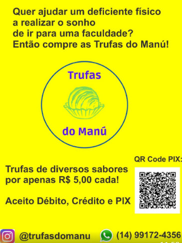 Ele também aceita encomendas pelo WhatsApp (14) 99172-4356 e pelo Instagram https://www.instagram.com/trufasdomanu/