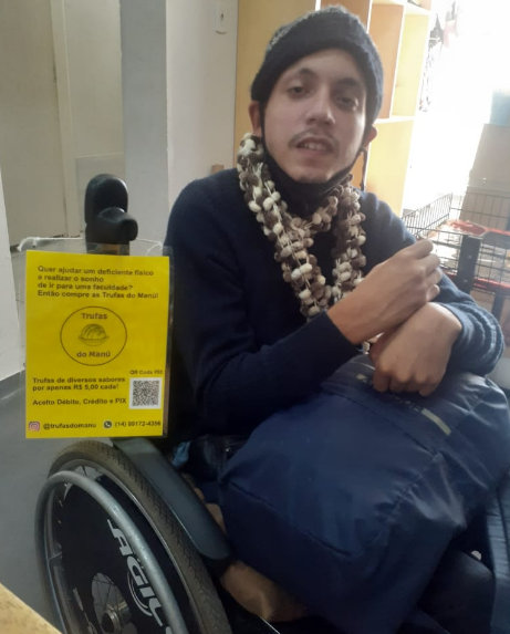 O jovem Manoel Lucas Moreira Leite Souza, de 25 anos, morador de Marília tem limitações de movimento que exigem o uso de cadeira de rodas e muletas para sua locomoção. Mas, o seu desejo de vencer é mais forte e nem mesmo a dificuldade o impede de rodar a cidade vendendo trufas.