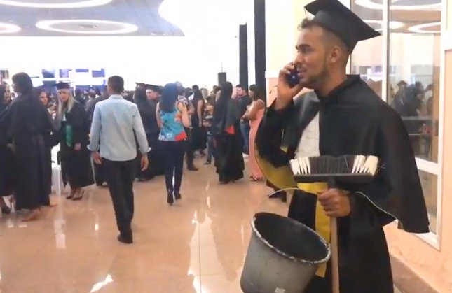 O ex-faxineiro Ronaldo Rocha, de 24 anos, é o mais novo jornalista formado de Brasília. Ele subiu no palco durante a colação de grau com um balde, rodo e vassoura na mão, sendo ovacionado pela plateia, dentre amigos, colegas e familiares.