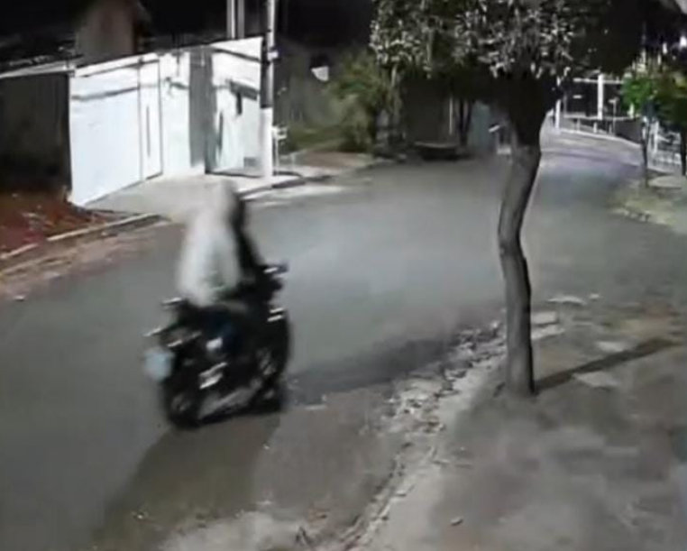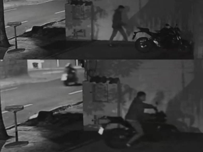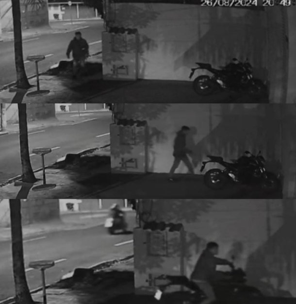 O local é monitorado por câmeras de segurança. As imagens mostram um indivíduo trajando calça jeans e moleton indo até a motocicleta e, em segundos, furta o veículo e sai acelerando.