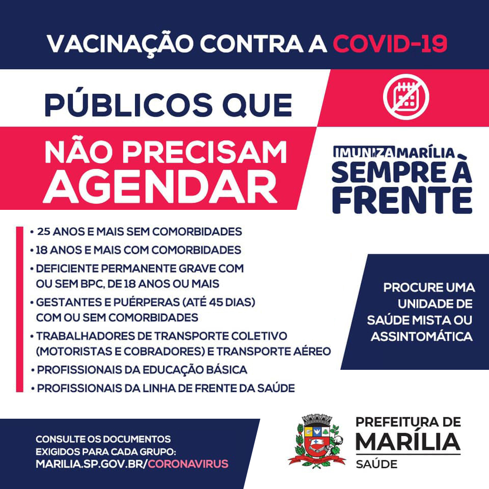 A Secretaria Municipal da Saúde de Marília anunciou hoje que os jovens com 25 anos e mais, sem comorbidades, já poderão receber a primeira dose da vacina contra a Covid-19 nas unidades de saúde assintomáticas e mistas. Basta procurar as unidades de saúde.