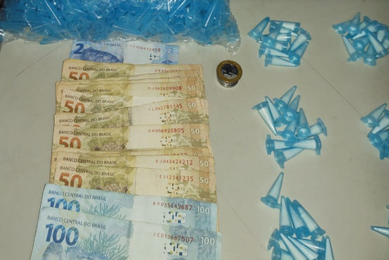 Em vistoria feita no telhado, foi localizado mais três sacolas plásticas contendo pinos com cocaína prontas para venda e mais 4.000 (quatro mil) pinos vazios.A dupla (indivíduo de 18 anos e um menor infrator de 17 anos) confessou que vendiam os entorpecentes. A quantia de R$ 1.155,00 em dinheiro (da venda das drogas) também foi apreendida.