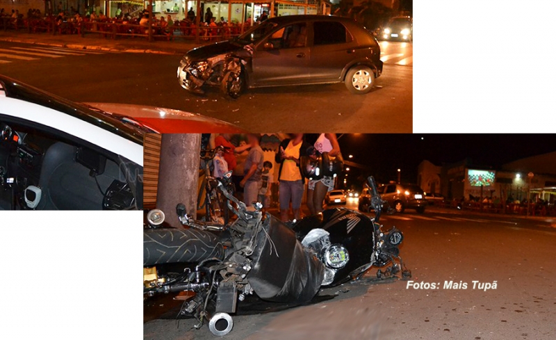 CARRO X MOTO - Outro grave acidente ocorreu na noite deste sábado, em Tupã, envolvendo uma moto CB 500 e um Celta. De acordo com a Polícia Militar, o motorista do carro ao chegar no semáforo localizado na esquina da ruas Nhambiquaras e Brasil fez uma conversão para entrar nessa última via momento que, por motivos a serem apurados pela perícia técnica, houve a colisão com a Honda- CB 500 que vinha pela Rua Nhambiquaras.