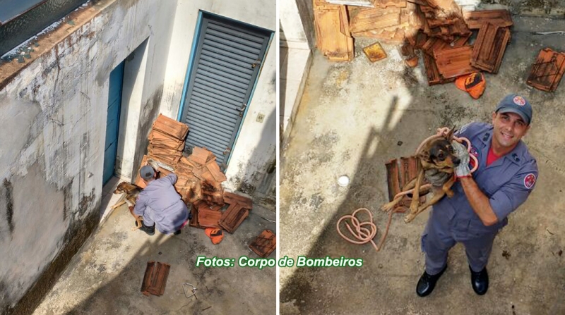 Um dos bombeiros desceu de corda, amarrou o cãozinho que foi resgatado e levado ao setor de zoonozes, onde ficou sob os cuidados dos veterinários.