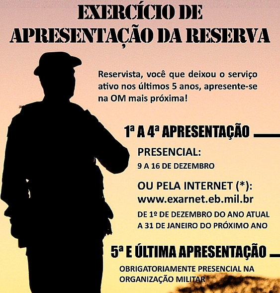 No caso do Exército, a opção pela internet é: www.exarnet.eb.mil.br . Caso o reservista se apresente depois do período normal será cobrada uma multa.
