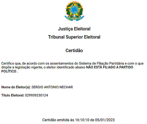 A dúvida ocorre porque o primeiro suplente à vaga, o ex-deputado e atual Secretário Municipal da Saúde, Sérgio Nechar, não estaria filiado a nenhum partido político, conforme certidão expedida pelo Tribunal Superior Eleitoral, datada do dia 5 de janeiro (foto).