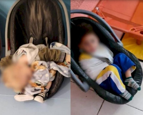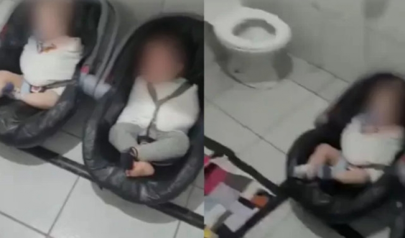 As imagens que circularam nas redes sociais, mostravam crianças chorando, amarradas com lençóis, e presas a cadeirinhas de bebês dentro do banheiro da escola.