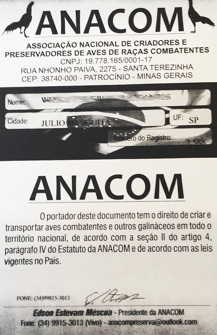 OUTRO LADO - Nesta tarde, o advogado do proprietário dos galos, Marcos José Vieira, ligou para a redação do portal Visão Notícias e informou que seu cliente é integrante de uma entidade criadora de animais para briga (ANACOM - Associação dos Criadores e Preservadores de Raças de Aves, com sede em Minas Gerais. Clique AQUI) e teria autorização para criação dessas aves, inclusive para venda. Negou que no local estaria sendo praticada o "combate".