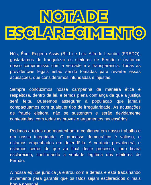 O juiz eleitoral de Garça, Felipe Guinsani, concedeu uma tutela de urgência impedindo a diplomação do prefeito eleito do município de Fernão (a 60 km de Marília), Éber Rogério Assis (o Bill); do seu vice, Luiz Alfredo Leardini (Fredo), bem como do vereador eleito, Daniel Ferratto. Eles e também a presidente do partido Podemos, Ester Farias de Oliveira Leardini, são acusados de abuso de poder político, conforme ação movida pelo Ministério Público Eleitoral. Bill foi eleito em Fernão com diferença de apenas um voto.