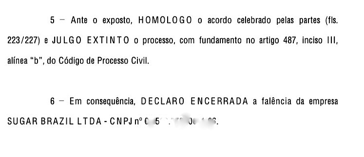 Na sentença, o juiz destacou que o acordo celebrado entre as partes descaracterizou o estado de insolvência da empresa, atendendo ao princípio da preservação da empresa e ao interesse social envolvido. A decisão resultou na homologação do acordo e no encerramento definitivo do processo, com a declaração de extinção da falência da Sugar Brazil Ltda.