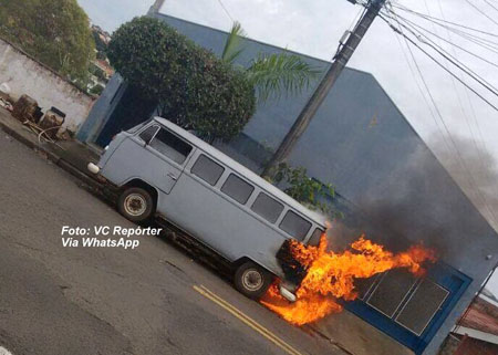 De acordo com testemunhas, o fogo começou no motor da Kombi e rapidamente as chamas se alastraram, ameaçando destruir completamente o veículo.