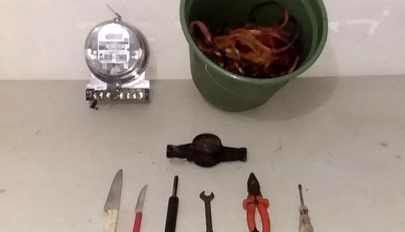 Dentro de uma bolsa que estava com eles foram localizados o medidor de energia, alicate, chave de fenda e na fogueira pedaços de fios e um hidrômetro já consumido pelo fogo.
