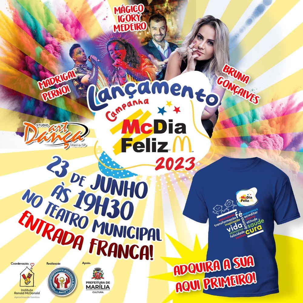 O lançamento do McDia Feliz 2023 em Marília acontece nesta sexta-feira, a partir das 19h30, no Teatro Municipal "Waldir Silveira Mello".