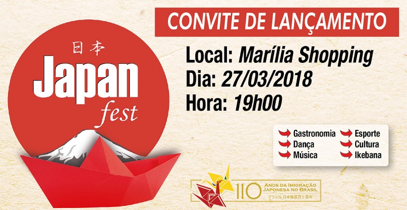 Em sua décima sexta edição, a Japan Fest, festa tradicional da colônia japonesa, que se tornou parte do calendário turístico do Estado de São Paulo e que atrai todos os anos milhares de pessoas da região, terá seu lançamento oficial nesta terça-feira (27), a partir das 19h, na praça de eventos do Marília Shopping.