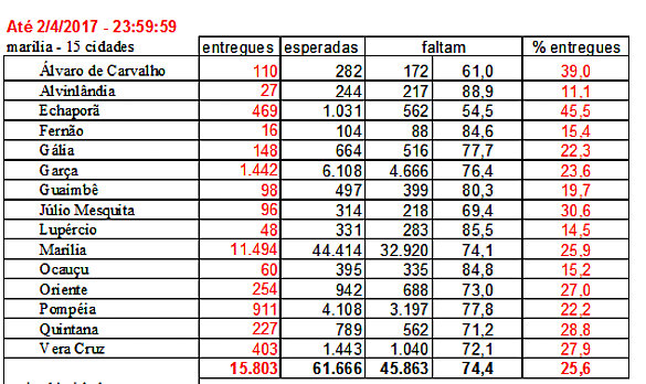 "44.666 declarações foram recebidas pelos sistemas da Receita, relativamente à região da Delegacia de Marília, que compreende 56 municípios. A expectativa é de que sejam entregues 160.203 declarações dentro do prazo", diz a nota divulgada pela Receita. A multa para o contribuinte que não fizer a declaração ou entregá-la fora do prazo será de, no mínimo, R$ 165,74. O valor máximo correspondente a 20% do imposto devido.
