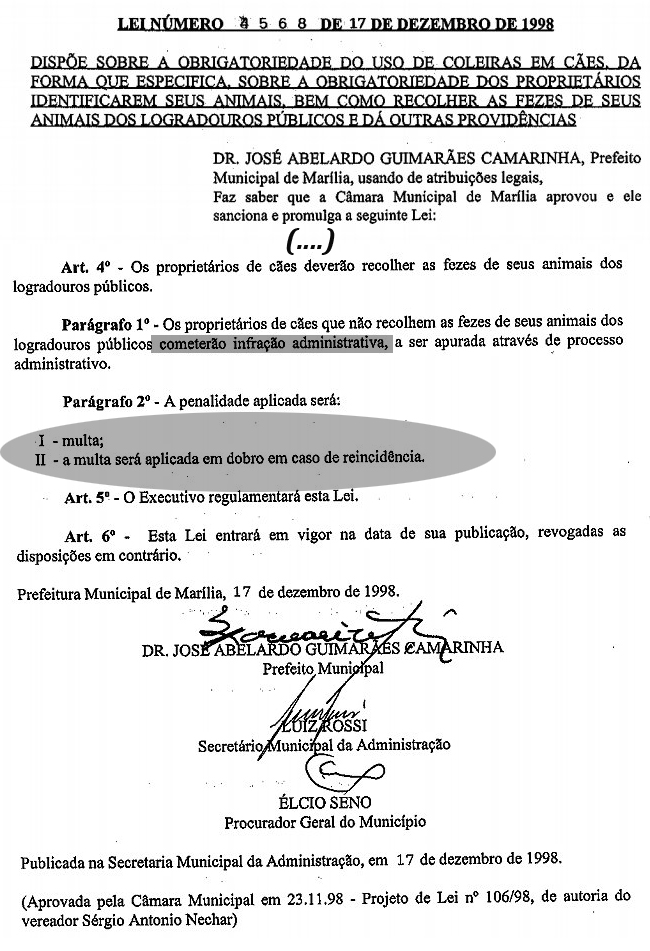 EM MARÍLIA - O portal Visão Notícias.com pesquisou junto ao site da Câmara Municipal (item sobre legislação) e encontrou a lei 4.568 (dezembro/1998) que trata muito superficialmente sobre o assunto e que, na prática, nenhum dono de animal acaba sendo multado.