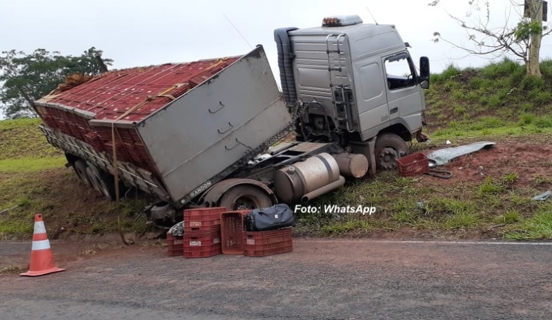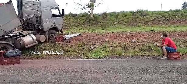 A carreta saiu para o acostamento e desceu uma pequena ribanceira existente no local. Por sorte não chegou a tombar.