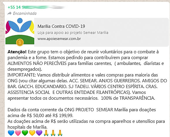 Outra mobilização é do "Grupo de Amigos em Marília", com apoio do Projeto Semear, que se organizou para arrecadar recursos para comprar respiradores para o Hospital das Clínicas. Mais informações poderão ser obtidas através do e-mail apoiesemearmarilia@gmail.com