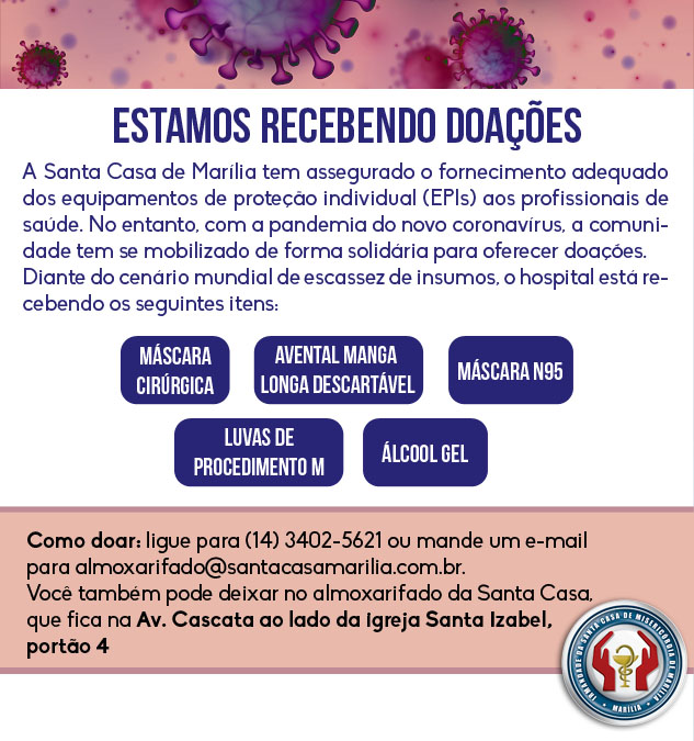 Já a campanha da Santa Casa de Marília tem por objetivo arrecadação de outros materiais usados pelas equipes, ou seja, máscaras cirúrgicas, avental manga longa descartável, máscaras N95, luvas de procedimento e também álcool gel.
