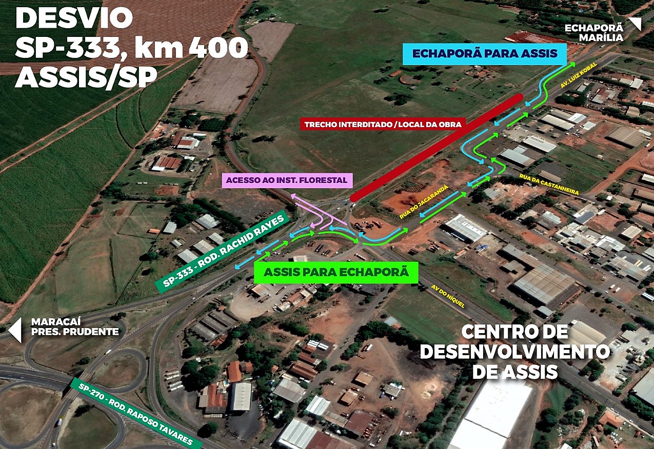 - Assis – Marília: O condutor acessará a alça de saída da Raposo Tavares no km 444, na pista Oeste (Ourinhos - Prudente) e seguirá pelo desvio sinalizado, na rua do Jacarandá, rua da Castanheira e avenida Luiz Kobal, até acessar a SP-333 e seguir viagem.