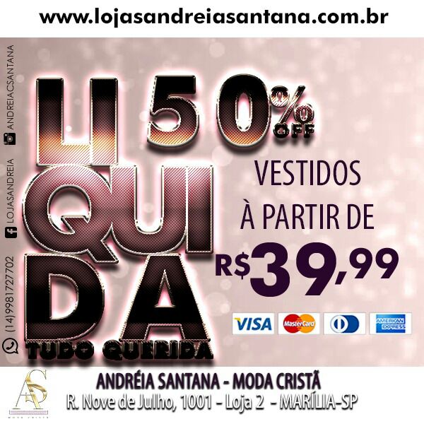 Com qualidade e ótimos preços, a loja Andreia Santana está com promoção imperdível até o próximo dia 10 (sábado). Toda loja com descontos de 50%. Vestidos, a partir de R$ 39,99.