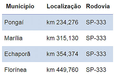 Praças de Pedágio - São quatro praças de pedágio na SP-333, região de Marília, onde os equipamentos entrarão em operação, nos dois sentidos. Confira: