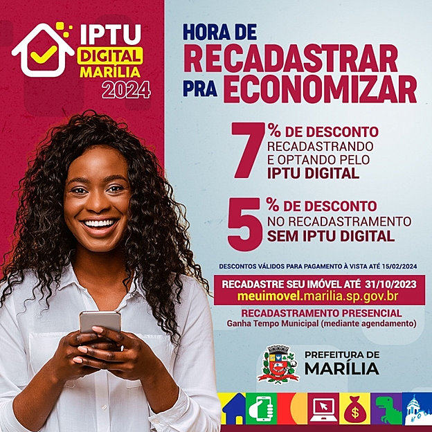 O prazo para garantir o desconto de 7% no pagamento do carnê do IPTU (Imposto Sobre a Propriedade Predial e Territorial Urbana) do exercício de 2024 de Marília só vai até o próximo dia 31 de outubro.
