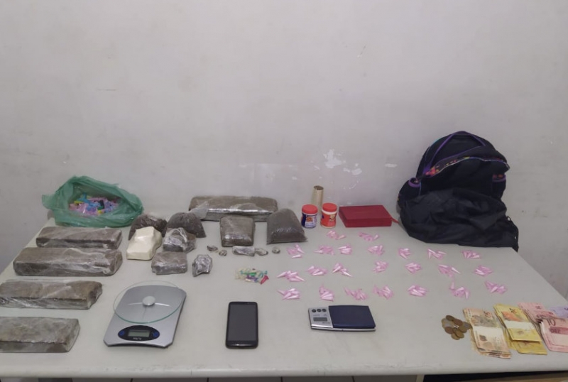 Em busca no imóvel foram localizados no guarda roupas do indivíduo, um tablete de maconha, 2 tabletes de crack, diversas porções de maconha, pinos de crack e de cocaína, 2 balanças de precisão, frascos com substância branca aparentando ser cocaína, 132 pinos vazios,1 celular e R$ 780,60 em dinheiro.