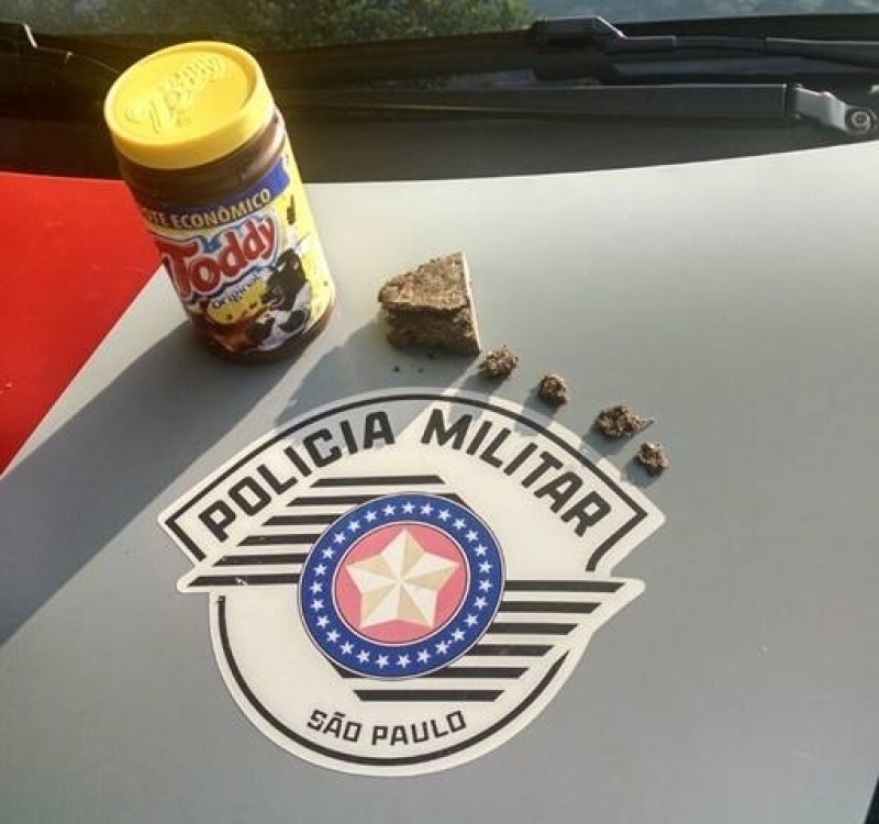 Com a chegada da Polícia, os militares realizaram buscas e encontraram dentro de um pote de achocolatado, um tijolo de maconha e algumas porções da droga.