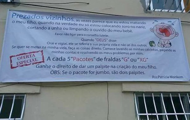 É bem provável que o choro da criança tenha chamado a atenção dos moradores e reunido denúncias ou reclamações sobre uma suposta má conduta da mãe, que utilizou a faixa para se explicar.
