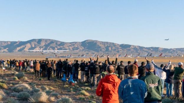 O aparelho consiste em duas máquinas gêmeas, sustentadas por seis motores a jato. Neste sábado, ele voou durante duas horas e meia sobre o deserto, atingindo velocidades de 274 km/h e a altitude de 4.572 metros.