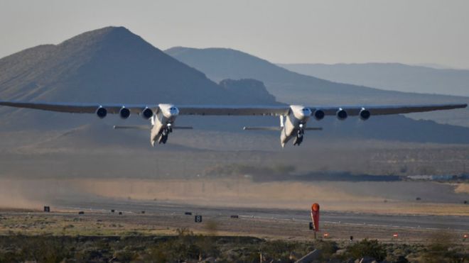 O Stratolaunch possui um comprimento de 73 metros, do nariz à cauda.