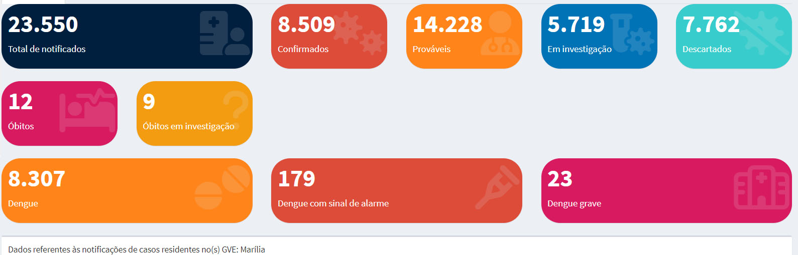 Marília lidera essa lista, com 12 mortes e outras nove aguardando resultados do Instituto Adolfo Lutz. Além disso, há 23 pessoas internadas em estado grave por causa da doença que supera 8.500 casos confirmados na cidade.