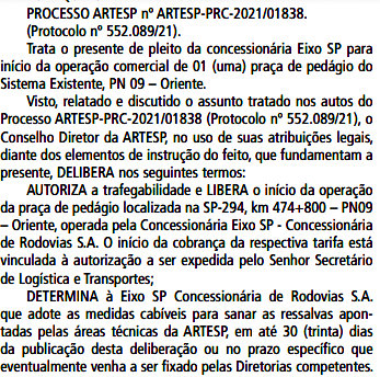 Entretanto, ainda de acordo com a Deliberação, a concessionária Eixo SP precisa adotar medidas cabíveis para sanar problemas apontados pelas áreas técnicas da Artesp, em até 30 dias da publicação ou no prazo específico que, eventualmente, venha a ser fixado pelas Diretorias competentes.
